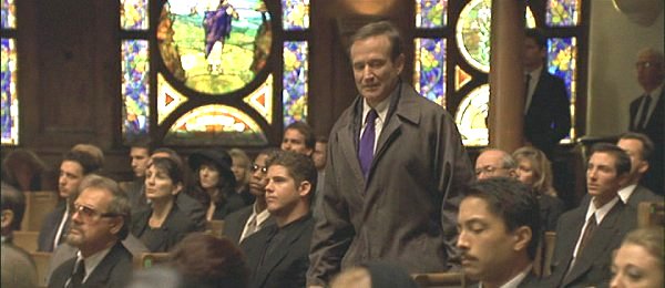In Summer 1997, I worked as an extra for two days at a Baptist Church in Oakland for Robin Williams' character's funeral. They filmed a short scene of the ghosts Cuba Gooding Jr. and Robin Williams talking in the back of the church, but it was cut from the final movie I was standing right by Cuba in that one. I am not in the picture above since in this shot I was cut off just to the right. There was one more shot in which I was sitting near the front of the church, but I ended up so blurred that it's impossible to tell that it's me.
