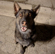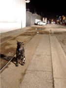 In February 2007, Sadie worked in a short student film called Fold (formerly known as Maki), produced by Sam Raimi's production company, Ghost House Pictures. She was temporarily painted all black, she dies in her scene (she's barking inside a pick-up truck that gets blown up), and she belongs to a character called Suicide Man, portrayed by the great Clint Howard. The scene was filmed southeast of Downtown Los Angeles, and that's her trainer, Sarah Clifford, in the fourth picture above.