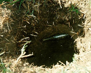 07 / 11 / 1997 Barb VOSS, Emily DEAN, Rob SCHMIDT, Scott TRIMBLE. Working in pairs, we worked at different parts of the field by the old footbridge in Tennessee Hollow, digging shovel test survey units. The STSs, 16" wide and 3' deep, yielded a Dr. Pepper bottle from about 40-50 years ago, Spanish colonial era ceramics, and other miscellaneous pieces of glass, shell, etc.