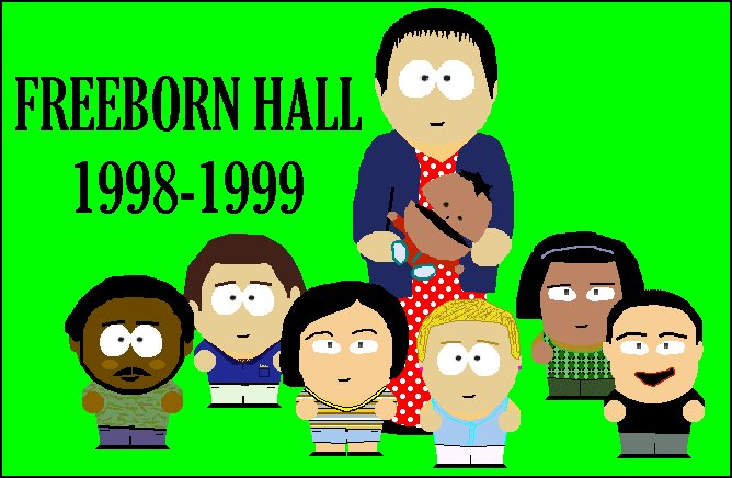 The Freeborn Hall Staff (J.C. Crump, Scott Trimble, Jennifer Ahn, Belinda Cortez-Vazquez with baby Kalen, Dori Traube, Azalea Jusay, Kazuo Semitsu) as South Park characters, altered Sep 1998, [enlarge]. |
