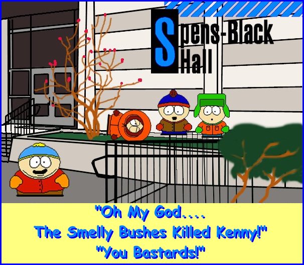 The South Park characters at Spens-Black Hall, created Feb 1998 for the official Spens-Black T-shirt, [enlarge]. |