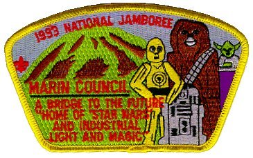 Scan of the PATCH used for the Marin Council's Troop 603 at the 1993 Boy Scout National Jamboree in Fort A.P. Hill, VA. This patch became one of the most popular at the Jamboree for Scouts to trade and was featured in many newspapers and news reports, designed Summer 1993, [enlarge]. |