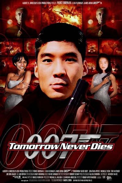 Dayhawk Kim as Pierce Brosnan (with Sehba Zhumkhawala & Mayling Wu) in Tomorrow Never Dies, altered Dec 1997, [enlarge]. |