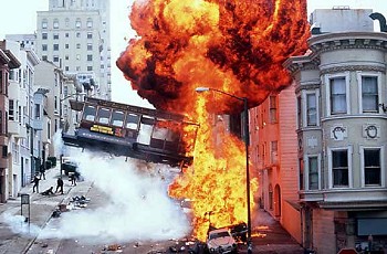 Landmarks destroyed: A cable car is blown up, along with half of Alcatraz.