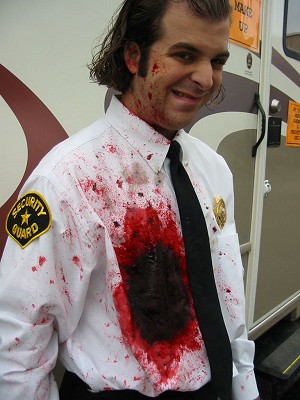 Since I had never before had the chance to be killed on screen, I also agreed to a cameo in the movie. I portrayed the dorky security guard who exits the bathroom in the middle of a hold-up and immediately gets a shotgun blast to the stomach. The behind-the-scenes photo to the left shows what the make-up job looked like. The other security guard, the one that survived, was played by the building liaison.
