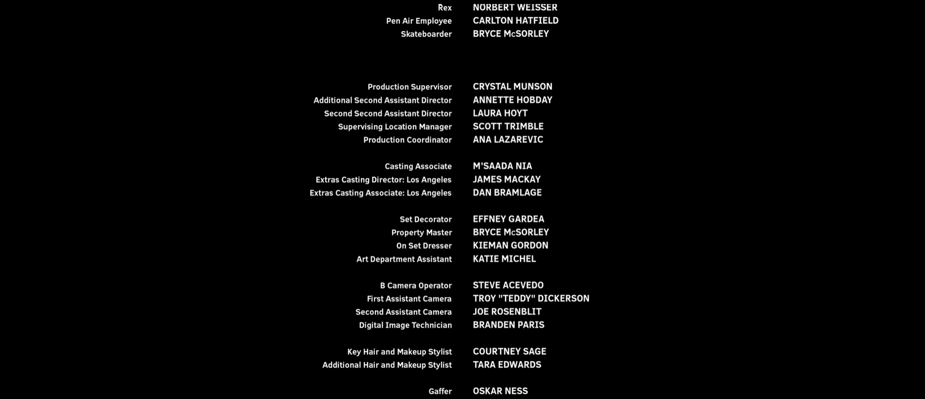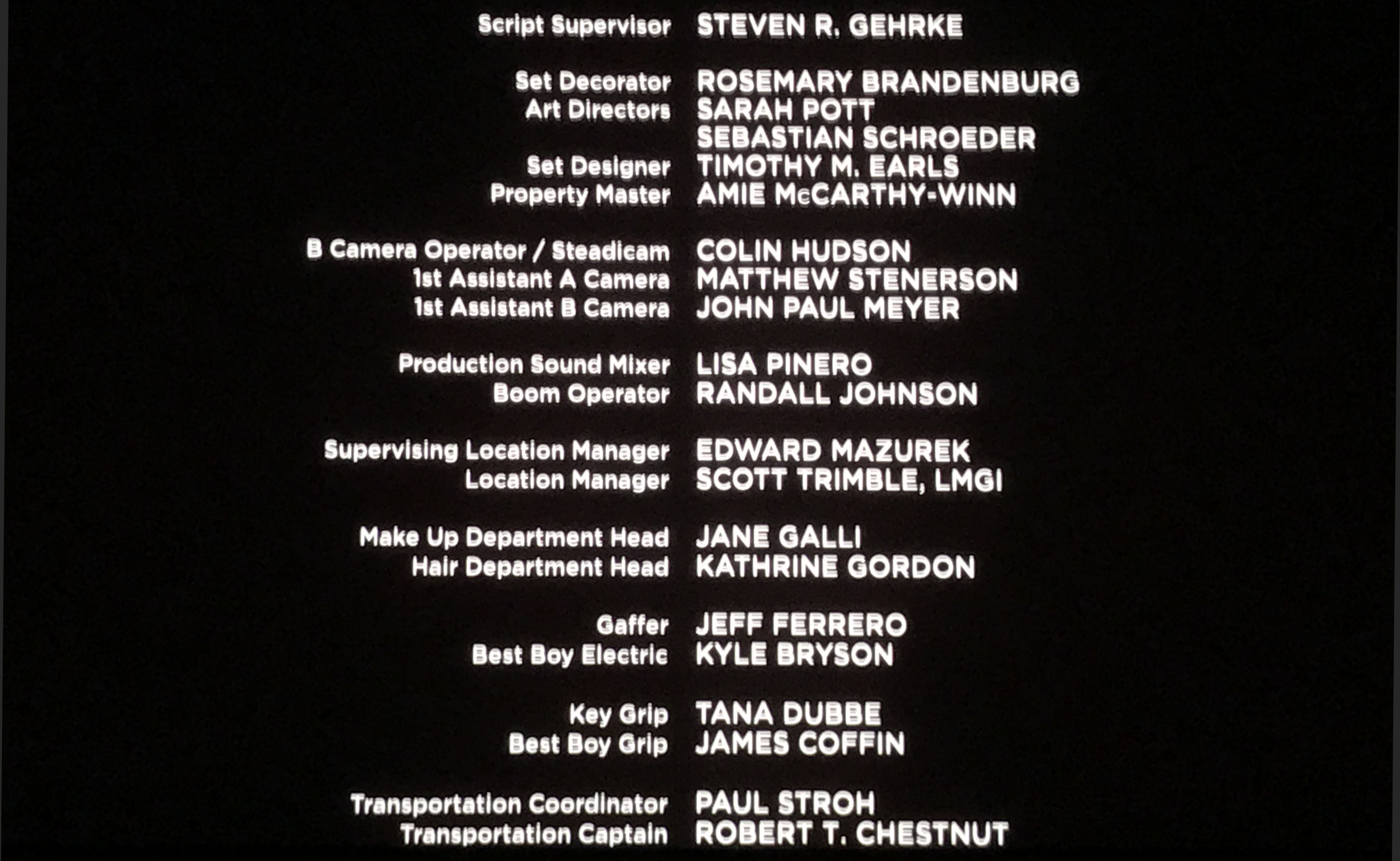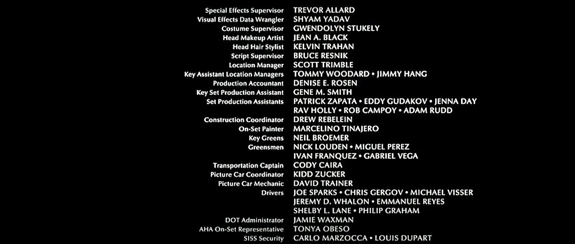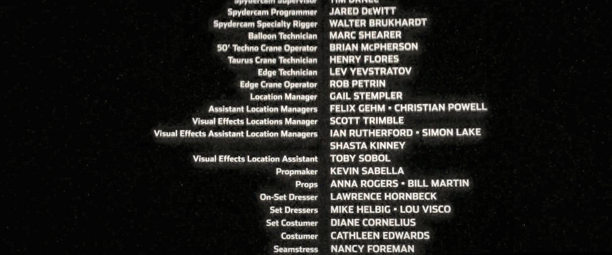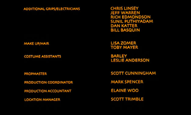 The on-screen credits are often only half or less of the actual number of people who worked on that film. For example, I worked over six months on Sweet November (2001), but my name did not appear on screen. Thus, my résumé is a better reflection of what I have actually done. This list is for personal trivia and historical preservation only.