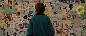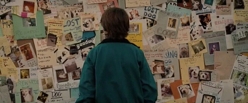In the film Super 8, directed by J.J. Abrams, Sadie appears as one of the town's missing dogs. The shot at the top was captured from the trailer. The first image on the second line shows a yellow highlight marking Sadie's picture. And the final one is a larger version of the same photograph.